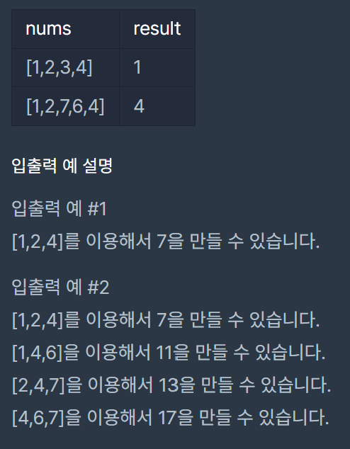 숫자들이 들어있는 배열 nums 가 매개변수로 주어질 때, nums 에 있는 숫자들 중 서로 다른 3개를 골라 더했을 때 소수가 되는 경우의 개수를 return 하도록 solution 함수를 완성하기