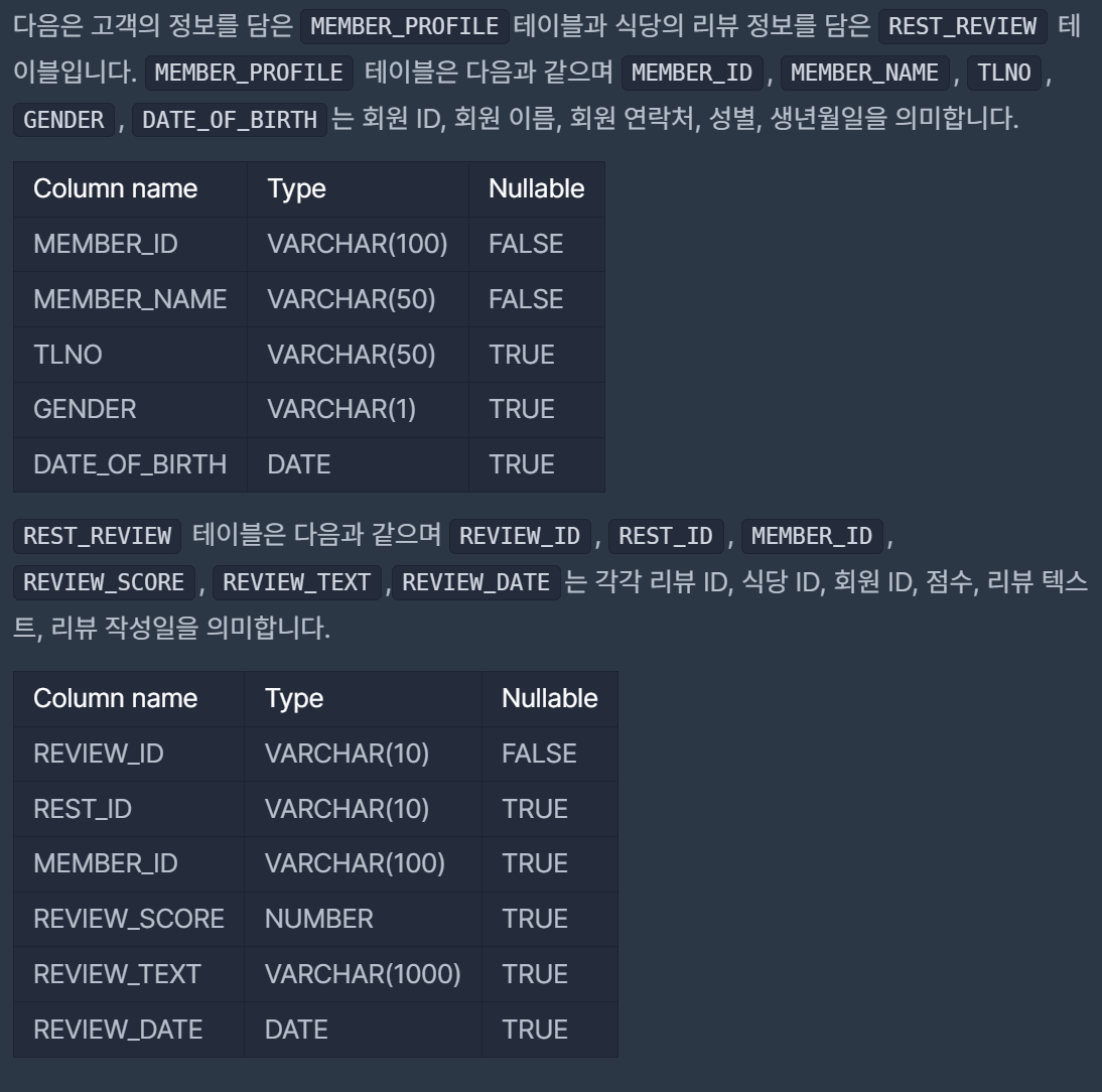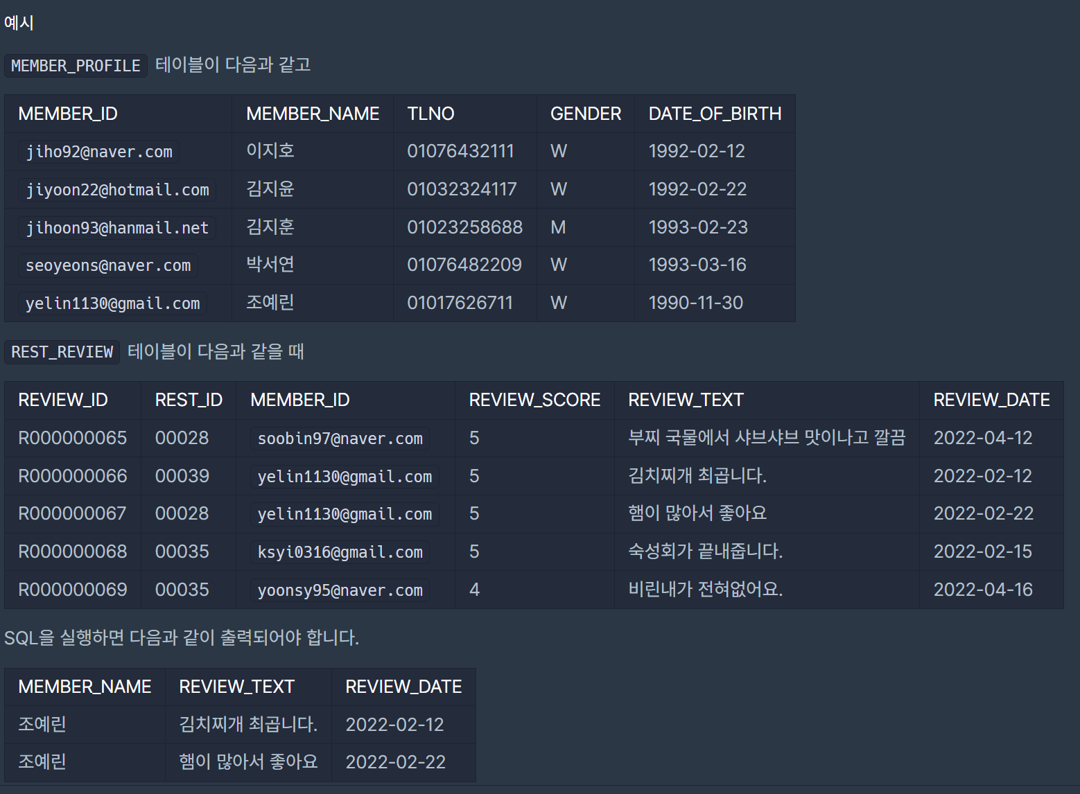 - JOIN: MEMBER_PROFILE 테이블과 REST_REVIEW 테이블을 MEMBER_ID로 조인합니다.