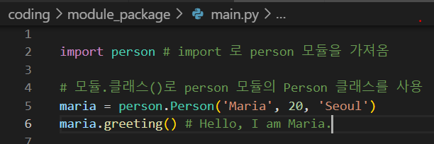 모듈의 클래스를 사용하는 방법도 변수, 함수와 같다. 즉, 모듈.클래스() 형식으로 모듈의 클래스를 사용하며, 클래스로 인스턴스를 만들 때는 person.Person('Maria', 20, 'Seoul') 와 같이 사용하면 된다.