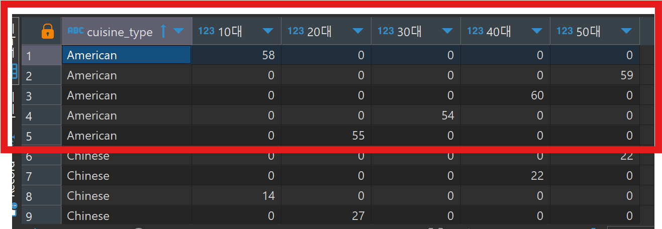- cuisine_type 별로 묶어준 뒤, 연령대 컬럼의 값들이 컬럼이 되도록, 그리고 생성된 컬럼들의 값들이 cnt_order 로 채워질 수 있도록 코드 작성 -> cusine_type 한 개 당 하나의 행을 가지도록 피벗팅